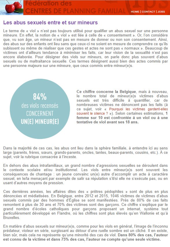 littérature Brochure - Droits de l'Enfance Rapport 2025 destiné à l'ONU sur les Dysfonctionnements institutionnels belges en protection de l'enfance Résumé du rapport 2025 destiné à l'ONU Mémoire sur les dysfonctionnements en protection de l’enfance en Belgique La problématique de Droits de l'Enfance est reconnue par l'O.N.U. depuis 2004 Violences sexuelles subies pendant l'enfance, la difficulté d'en parler Selon l’institut scientifique IWEPS, chaque jour en Wallonie, il y a 9 cas de viols d’enfants 84% des viols recensés concernent un(e) mineur(e)